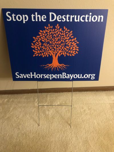Request a yard sign by emailing SaveHorsepenBayou@gmail.com or by clicking on the Dialog Button in the lower right-hand corner of this page. Be sure to include your street address and a sign will be delivered to your front door while supplies last. Due to high demand, we are currently having to limit signs to one per address.